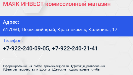 МАЯК-ИНВЕСТ, комиссионный магазин по адресу 617060, Пермский край, Краснокамск, Калинина, 17 в дальнейшем Организация, размещена в следующих категориях: