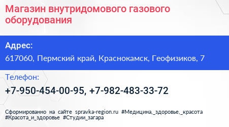 Магазин внутридомового газового оборудования по адресу 617060, Пермский край, Краснокамск, Геофизиков, 7 в дальнейшем Организация, размещена в следующих категориях: