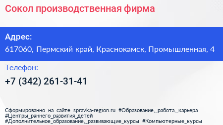 Сокол, производственная фирма по адресу 617060, Пермский край, Краснокамск, Промышленная, 4 в дальнейшем Организация, размещена в следующих категориях: