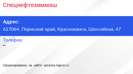 Спецнефтехиммаш по адресу 617064, Пермский край, Краснокамск, Шоссейная, 47 в дальнейшем Организация, размещена в следующих категориях: