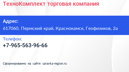ТехноКомплект, торговая компания по адресу 617060, Пермский край, Краснокамск, Геофизиков, 2а в дальнейшем Организация, размещена в следующих категориях: