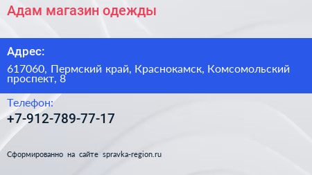 Адам, магазин одежды по адресу 617060, Пермский край, Краснокамск, Комсомольский проспект, 8 в дальнейшем Организация, размещена в следующих категориях: