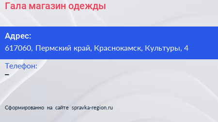 Гала, магазин одежды по адресу 617060, Пермский край, Краснокамск, Культуры, 4 в дальнейшем Организация, размещена в следующих категориях: