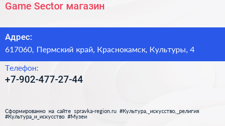 Game Sector, магазин по адресу 617060, Пермский край, Краснокамск, Культуры, 4 в дальнейшем Организация, размещена в следующих категориях: