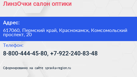 ЛинзОчки, салон оптики по адресу 617060, Пермский край, Краснокамск, Комсомольский проспект, 20 в дальнейшем Организация, размещена в следующих категориях: