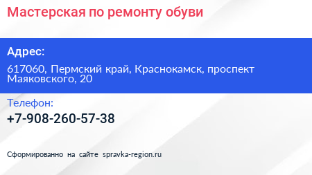 Мастерская по ремонту обуви по адресу 617060, Пермский край, Краснокамск, проспект Маяковского, 20 в дальнейшем Организация, размещена в следующих категориях: