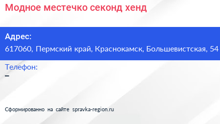 Модное местечко, секонд-хенд по адресу 617060, Пермский край, Краснокамск, Большевистская, 54 в дальнейшем Организация, размещена в следующих категориях: