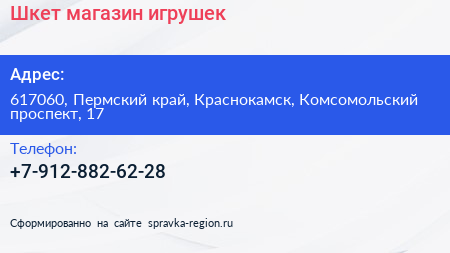 Шкет, магазин игрушек по адресу 617060, Пермский край, Краснокамск, Комсомольский проспект, 17 в дальнейшем Организация, размещена в следующих категориях:
