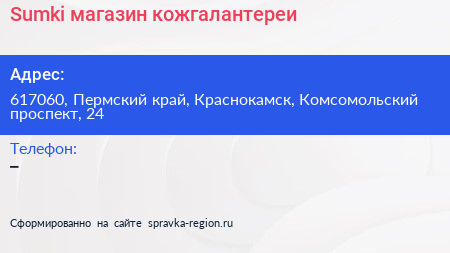 Sumki, магазин кожгалантереи по адресу 617060, Пермский край, Краснокамск, Комсомольский проспект, 24 в дальнейшем Организация, размещена в следующих категориях: