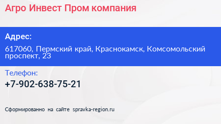 Агро-Инвест-Пром, компания по адресу 617060, Пермский край, Краснокамск, Комсомольский проспект, 23 в дальнейшем Организация, размещена в следующих категориях: