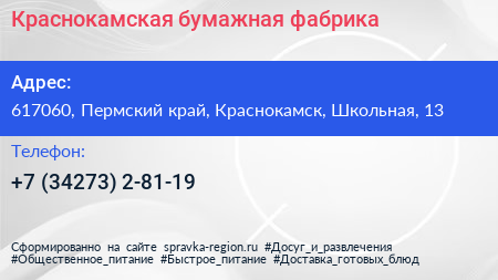 Краснокамская бумажная фабрика по адресу 617060, Пермский край, Краснокамск, Школьная, 13 в дальнейшем Организация, размещена в следующих категориях: