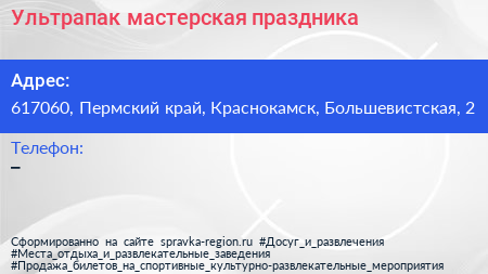 Ультрапак, мастерская праздника по адресу 617060, Пермский край, Краснокамск, Большевистская, 2 в дальнейшем Организация, размещена в следующих категориях: