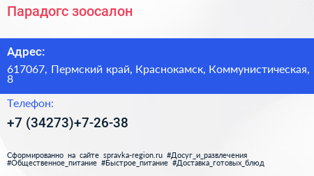 Парадогс, зоосалон по адресу 617067, Пермский край, Краснокамск, Коммунистическая, 8 в дальнейшем Организация, размещена в следующих категориях: