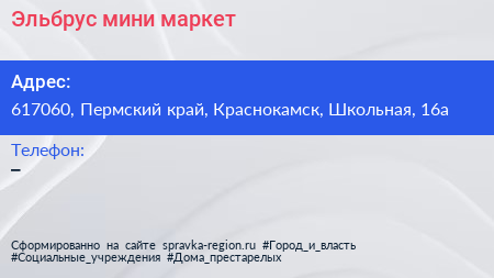 Эльбрус, мини-маркет по адресу 617060, Пермский край, Краснокамск, Школьная, 16а в дальнейшем Организация, размещена в следующих категориях: