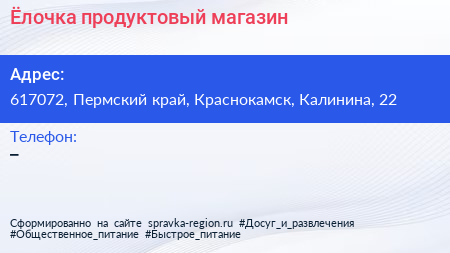 Ёлочка, продуктовый магазин по адресу 617072, Пермский край, Краснокамск, Калинина, 22 в дальнейшем Организация, размещена в следующих категориях: