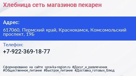 Хлебница, сеть магазинов-пекарен по адресу 617060, Пермский край, Краснокамск, Комсомольский проспект, 19Б в дальнейшем Организация, размещена в следующих категориях: