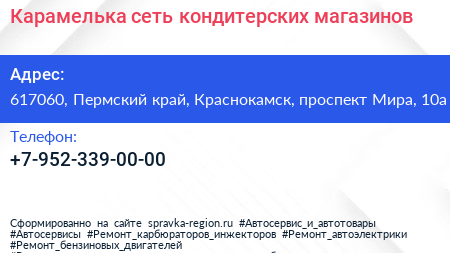 Карамелька, сеть кондитерских магазинов по адресу 617060, Пермский край, Краснокамск, проспект Мира, 10а в дальнейшем Организация, размещена в следующих категориях: