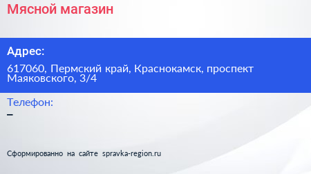 Мясной магазин по адресу 617060, Пермский край, Краснокамск, проспект Маяковского, 3/4 в дальнейшем Организация, размещена в следующих категориях: