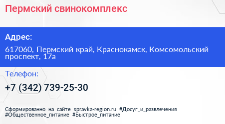 Пермский свинокомплекс по адресу 617060, Пермский край, Краснокамск, Комсомольский проспект, 17а в дальнейшем Организация, размещена в следующих категориях: