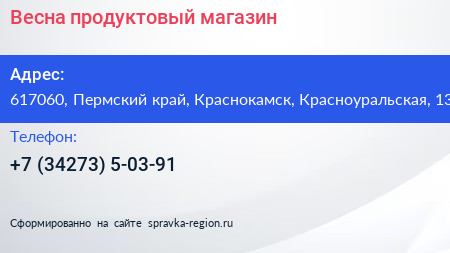 Весна, продуктовый магазин по адресу 617060, Пермский край, Краснокамск, Красноуральская, 13 в дальнейшем Организация, размещена в следующих категориях:
