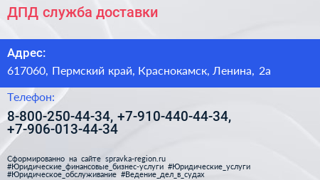 ДПД, служба доставки по адресу 617060, Пермский край, Краснокамск, Ленина, 2а в дальнейшем Организация, размещена в следующих категориях: