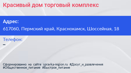 Красивый дом, торговый комплекс по адресу 617060, Пермский край, Краснокамск, Шоссейная, 18 в дальнейшем Организация, размещена в следующих категориях: