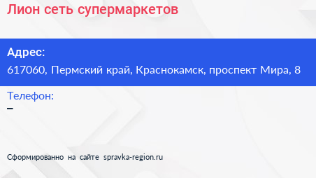 Лион, сеть супермаркетов по адресу 617060, Пермский край, Краснокамск, проспект Мира, 8 в дальнейшем Организация, размещена в следующих категориях: