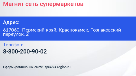 Магнит, сеть супермаркетов по адресу 617060, Пермский край, Краснокамск, Гознаковский переулок, 2 в дальнейшем Организация, размещена в следующих категориях: