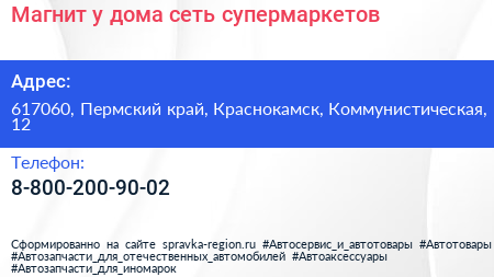 Магнит у дома, сеть супермаркетов по адресу 617060, Пермский край, Краснокамск, Коммунистическая, 12 в дальнейшем Организация, размещена в следующих категориях: