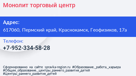 Монолит, торговый центр по адресу 617060, Пермский край, Краснокамск, Геофизиков, 17а в дальнейшем Организация, размещена в следующих категориях: