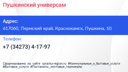 Пушкинский, универсам по адресу 617060, Пермский край, Краснокамск, Пушкина, 10 в дальнейшем Организация, размещена в следующих категориях: