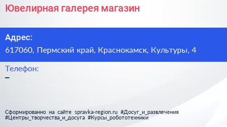 Ювелирная галерея, магазин по адресу 617060, Пермский край, Краснокамск, Культуры, 4 в дальнейшем Организация, размещена в следующих категориях: