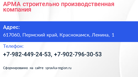 АРМА, строительно-производственная компания по адресу 617060, Пермский край, Краснокамск, Ленина, 1 в дальнейшем Организация, размещена в следующих категориях: