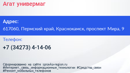 Агат, универмаг по адресу 617060, Пермский край, Краснокамск, проспект Мира, 9 в дальнейшем Организация, размещена в следующих категориях:
