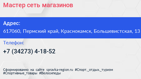Мастер, сеть магазинов по адресу 617060, Пермский край, Краснокамск, Большевистская, 13 в дальнейшем Организация, размещена в следующих категориях: