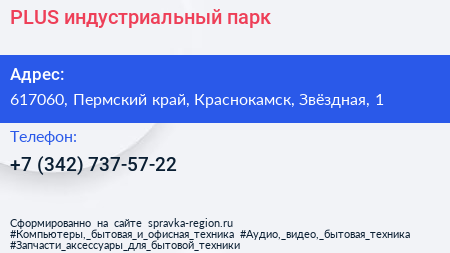 PLUS, индустриальный парк по адресу 617060, Пермский край, Краснокамск, Звёздная, 1 в дальнейшем Организация, размещена в следующих категориях: