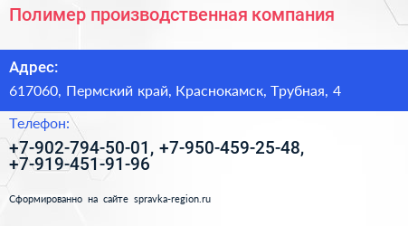 Полимер, производственная компания по адресу 617060, Пермский край, Краснокамск, Трубная, 4 в дальнейшем Организация, размещена в следующих категориях: