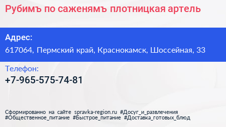 Рубимъ-по-саженямъ, плотницкая артель по адресу 617064, Пермский край, Краснокамск, Шоссейная, 33 в дальнейшем Организация, размещена в следующих категориях: