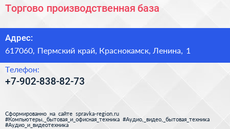 Торгово-производственная база по адресу 617060, Пермский край, Краснокамск, Ленина, 1 в дальнейшем Организация, размещена в следующих категориях: