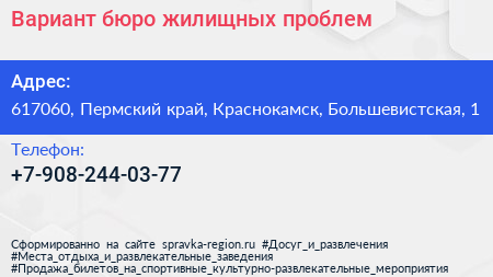 Вариант, бюро жилищных проблем по адресу 617060, Пермский край, Краснокамск, Большевистская, 1 в дальнейшем Организация, размещена в следующих категориях: