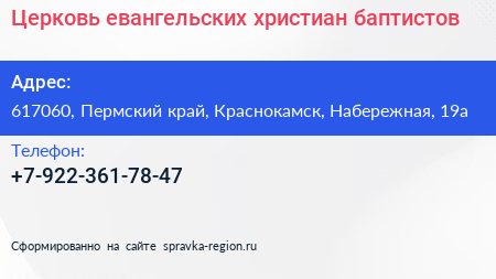 Церковь евангельских христиан баптистов по адресу 617060, Пермский край, Краснокамск, Набережная, 19а в дальнейшем Организация, размещена в следующих категориях: