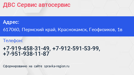 ДВС Сервис, автосервис по адресу 617060, Пермский край, Краснокамск, Геофизиков, 1в в дальнейшем Организация, размещена в следующих категориях: