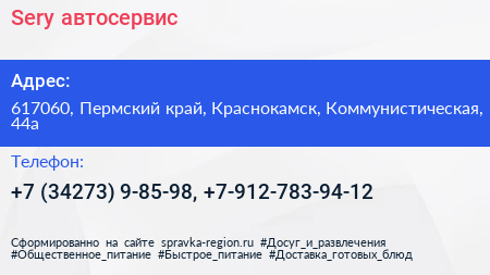 Sery, автосервис по адресу 617060, Пермский край, Краснокамск, Коммунистическая, 44а в дальнейшем Организация, размещена в следующих категориях: