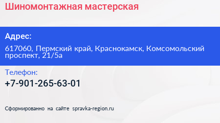 Шиномонтажная мастерская по адресу 617060, Пермский край, Краснокамск, Комсомольский проспект, 21/5а в дальнейшем Организация, размещена в следующих категориях: