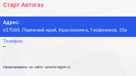 Старт-Автогаз по адресу 617060, Пермский край, Краснокамск, Геофизиков, 33а в дальнейшем Организация, размещена в следующих категориях: