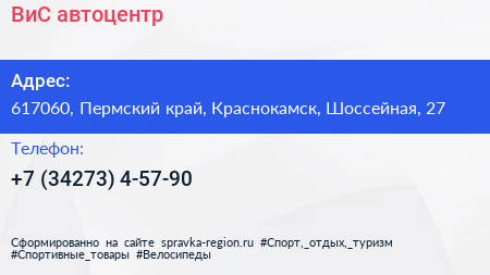 ВиС, автоцентр по адресу 617060, Пермский край, Краснокамск, Шоссейная, 27 в дальнейшем Организация, размещена в следующих категориях: