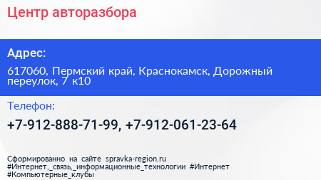 Центр авторазбора по адресу 617060, Пермский край, Краснокамск, Дорожный переулок, 7 к10 в дальнейшем Организация, размещена в следующих категориях: