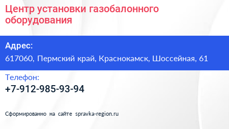 Центр установки газобалонного оборудования по адресу 617060, Пермский край, Краснокамск, Шоссейная, 61 в дальнейшем Организация, размещена в следующих категориях: