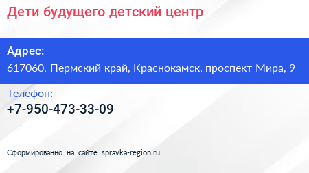 Дети будущего, детский центр по адресу 617060, Пермский край, Краснокамск, проспект Мира, 9 в дальнейшем Организация, размещена в следующих категориях: