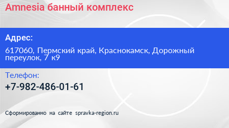 Amnesia, банный комплекс по адресу 617060, Пермский край, Краснокамск, Дорожный переулок, 7 к9 в дальнейшем Организация, размещена в следующих категориях: